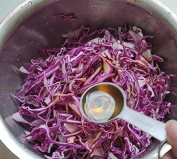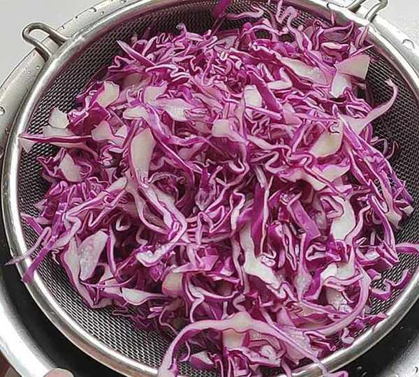第1步、紫甘蓝切细丝,用清水洗干净(我们这的水偏碱性,水变蓝色是正常的),捞出沥水。