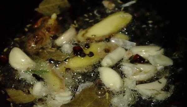 起锅入油入花椒、蒜、姜、香叶爆香后倒入小龙虾;
