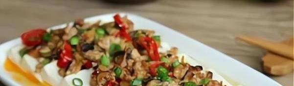 5.将炸好的肉酱铺在豆腐上,蒸8分钟。