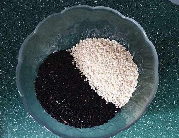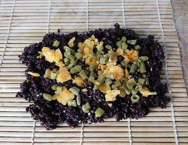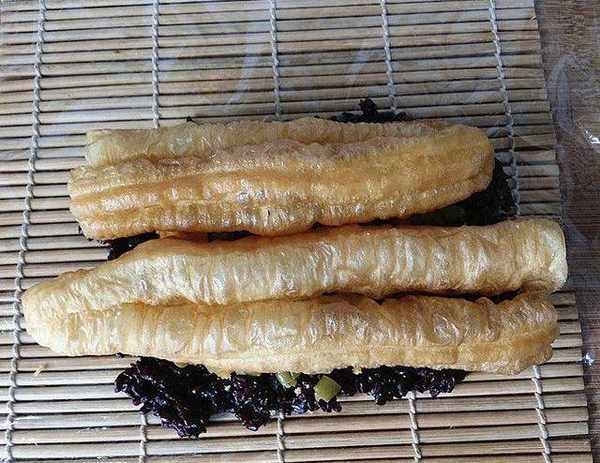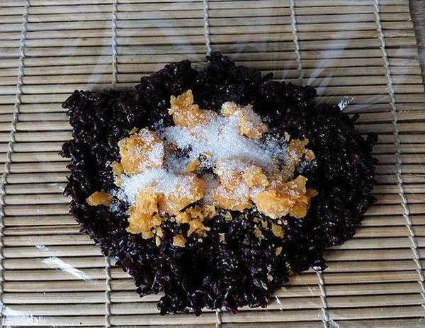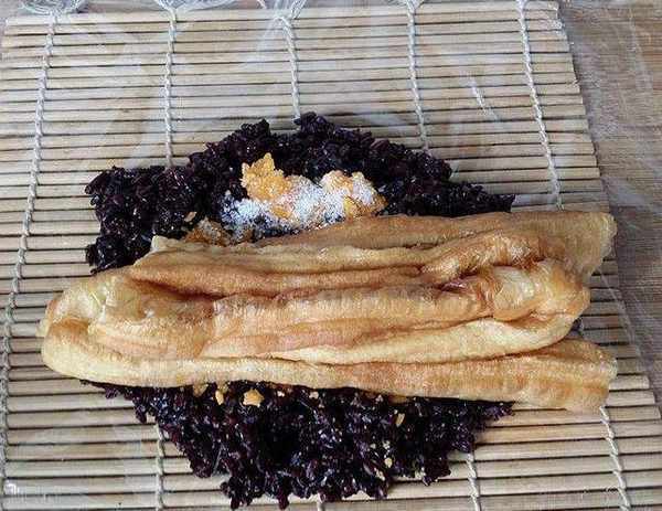 油条2根、糯米130克、黑米200克、咸蛋黄2个、酸豆角少许、白砂糖少许(咸鸭蛋黄提前蒸熟备用)
