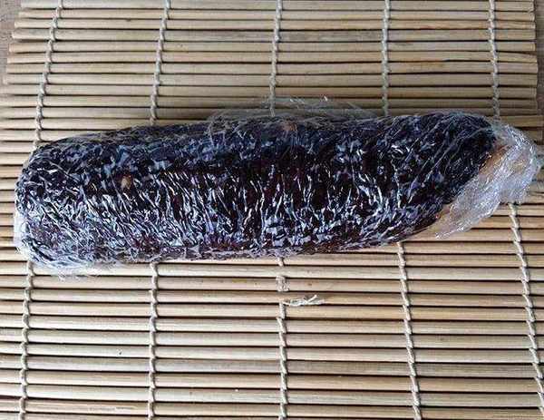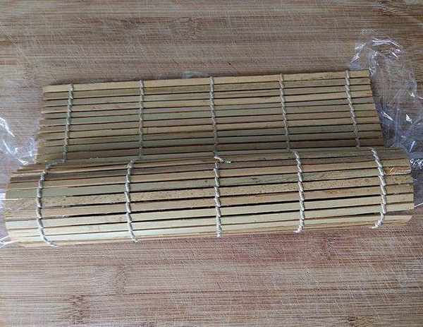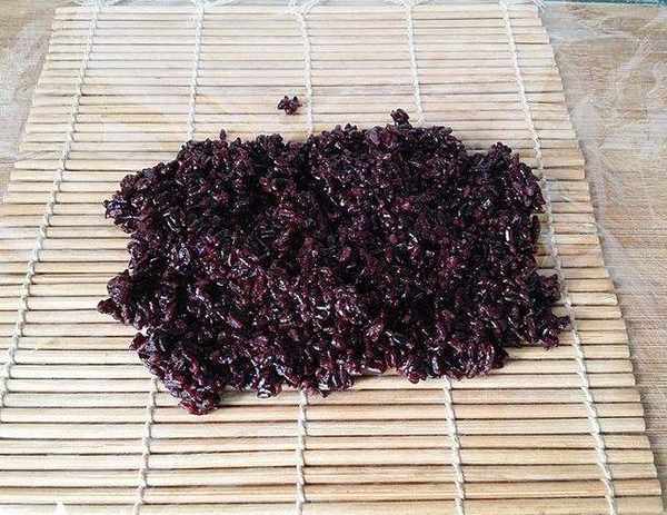 6、在寿司帘上铺张保鲜膜、放上适量黑糯米饭