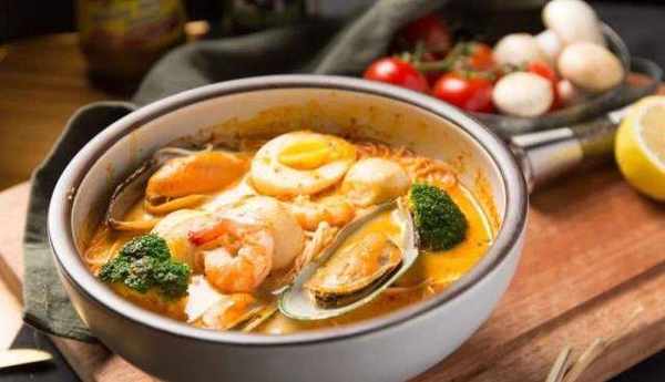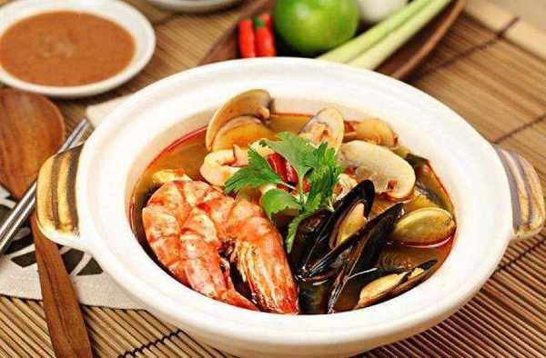 处理完所有食材之后,我们将开始制作了。先煮一锅开水。然后把冬阴功汤的汤底融化。然后放入龙虾,煮约3分钟。再将青口和鲍鱼放入锅里,再煮2分钟。让食材与冬阴功汤充分融合,这样一锅冬阴功海鲜汤。