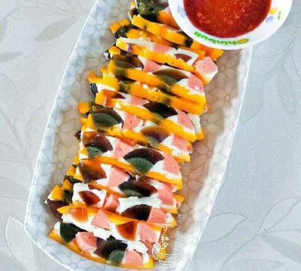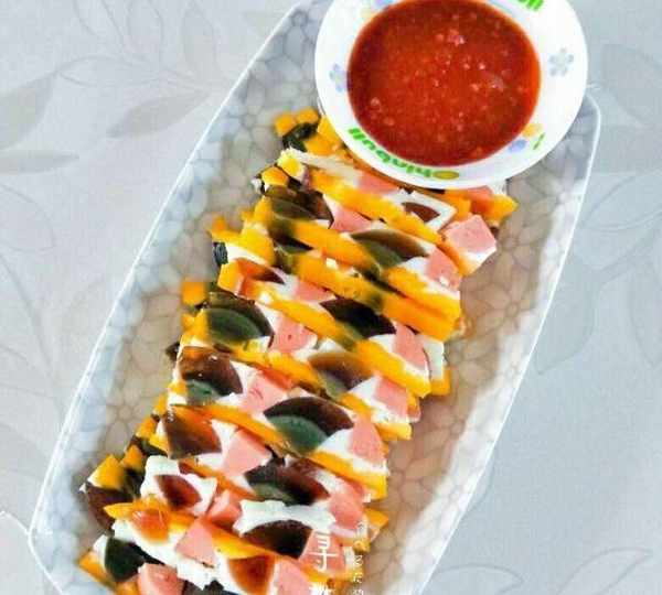 原料:火腿肠、鸡蛋、皮蛋、红酱、柠檬汁。