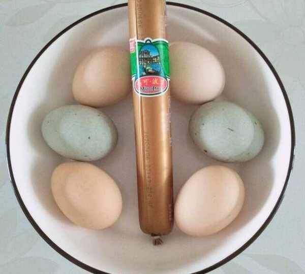 第1步、火腿肠1根,鸡蛋4个,皮蛋3个(摆盘时加了1个)。