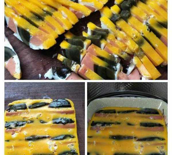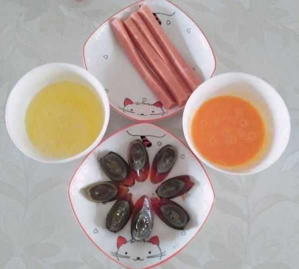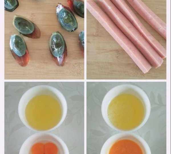 第2步、火腿肠切成四条,每个皮蛋切四瓣,蛋白蛋黄分开分别搅打,蛋白里加几滴柠檬汁。