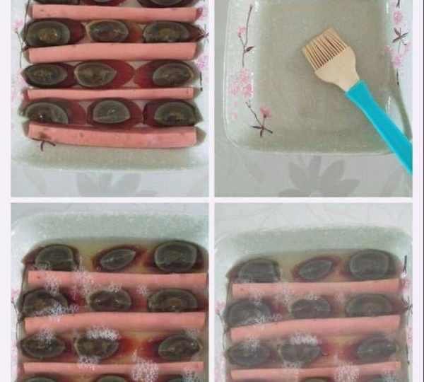 第4步、找一个深点的盘子,抹点油,把皮蛋火腿肠摆上,浇上蛋白,盖上薄膜,用牙签扎几个眼。