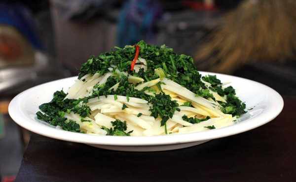 2、将炒锅置火上烧热,倒入植物油,烧至六成热时,下姜、葱爆香,再下山药、荠菜、料酒炒熟,加盐、鸡精即可。