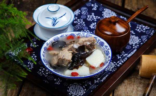 2、取砂锅一只,放入山药块、木耳、料酒、葱姜末、骨头汤,用旺火烧沸,改用小火炖至山药块断生,加盐、味精再稍炖至山药块熟烂,淋上香油即可。