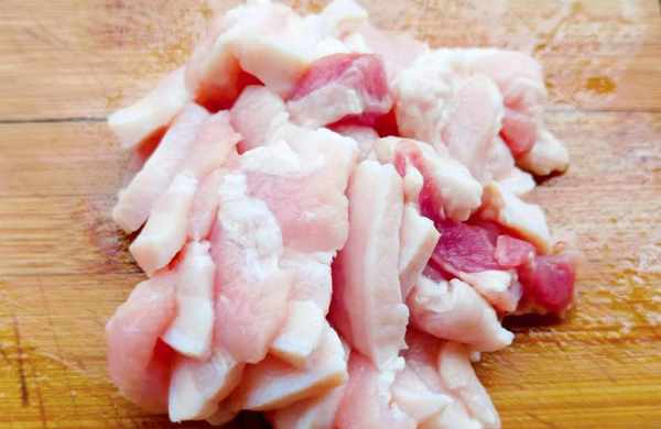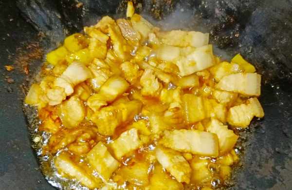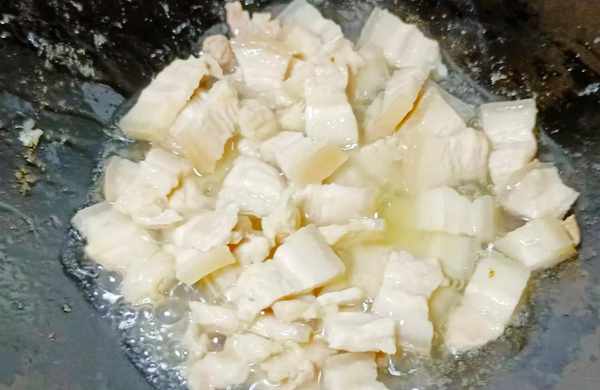 ⑥热锅冷油,倒入五花肉干煸。待五花肉变色后改小火继续干煸,等它表面微微发黄就可以了。
