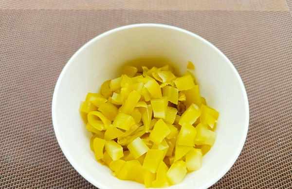 ④我们把酸菜叶子去掉,把酸菜杆部泡入水中。反复搓洗,去掉多余的盐味,切成小丁放入碗中。大家也可以用酸萝卜替代酸菜,效果是一样的。