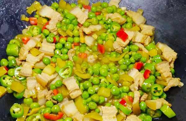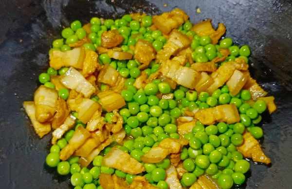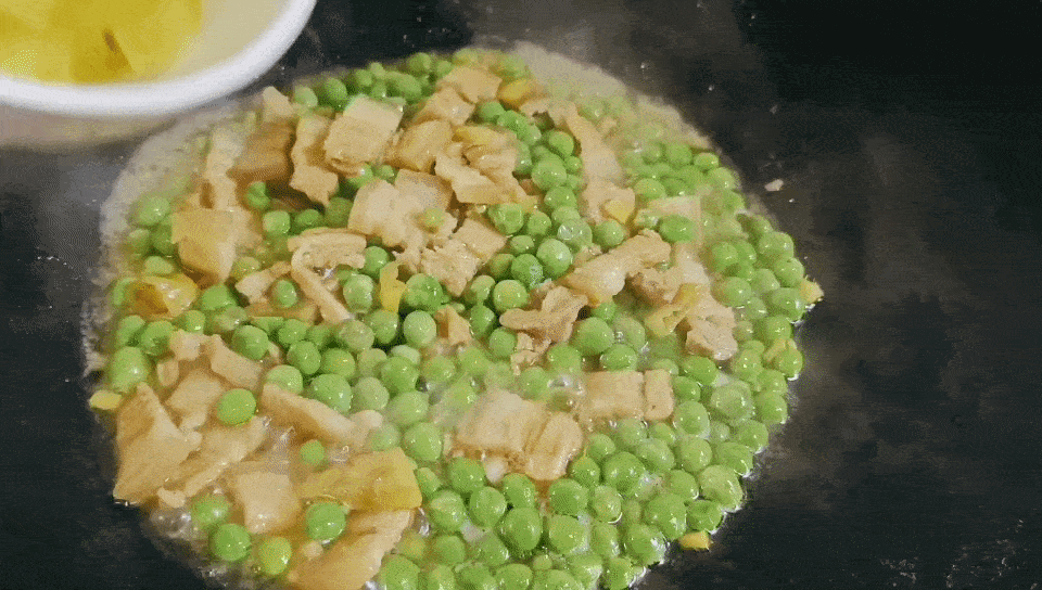 ⑧倒入豌豆米,翻炒均匀,大火爆炒几下。