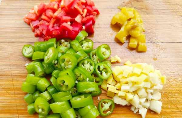 ③青红线椒清洗干净,分别切成小丁。姜和蒜子也搓洗干净,切成碎末。泡椒也切一下,留一点泡椒水。