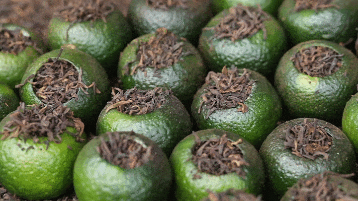 不同时期的新会柑,会衍化成不同的产品。八九月摘“小青柑”,往里面填普洱茶,晒干了便是小青柑茶;眼下采摘的正是黄绿相间的“二红柑”,成熟度刚好,用以晒陈皮;而到了12月采摘的“大红柑”,因经历风吹雨打所剩无几,也成了制成陈皮的最贵原料。