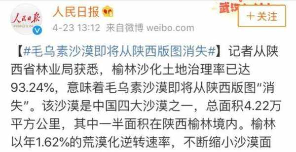 网上发布了一条“毛乌素沙漠即将从陕西版地图上消失”的消息,