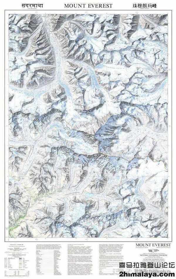 1988年Washburn的珠穆朗玛峰 - 这张地图依然被很多人视作是最为美丽的珠穆朗玛峰地图。这个绘图项目由制图者和探险者,Bradforf Washburn负责,绘制过程参考了难以找到的历史地图,测绘数据,一系列全新航拍照片和太空影像