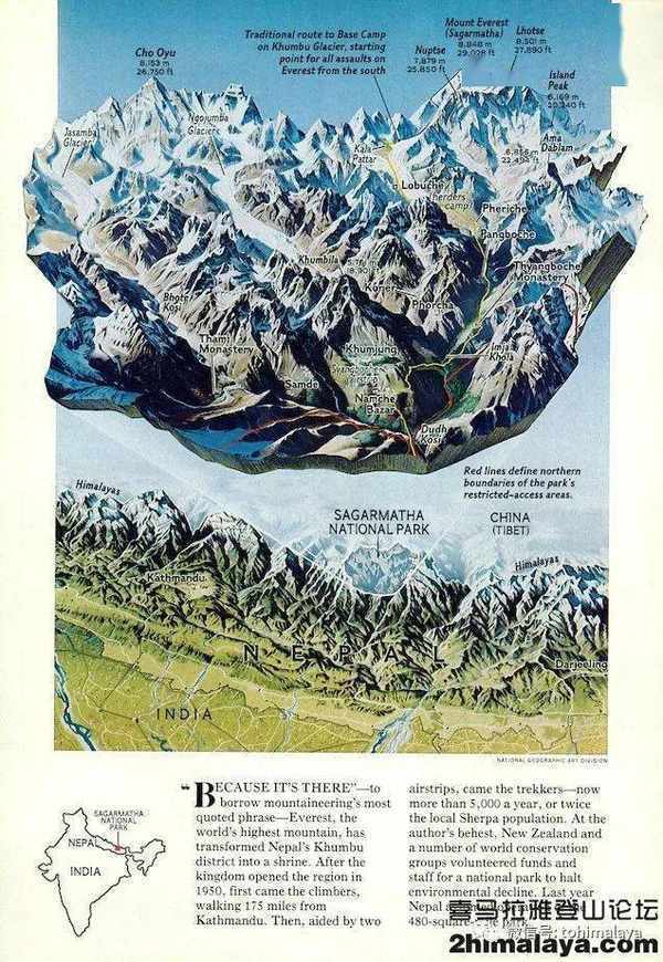 1982年,尼泊尔萨迦玛塔国家公园 - 上世纪七十年代,每年约有5,000名外国游客徒步徒步去往珠穆朗玛峰山区。由于需要燃料和进行登山探险活动,森林遭到了极大破坏。作为应对,1976年,尼泊尔政府成立了萨迦玛塔国家公园。这张三维地图展示了公园的保护区域