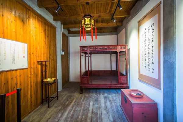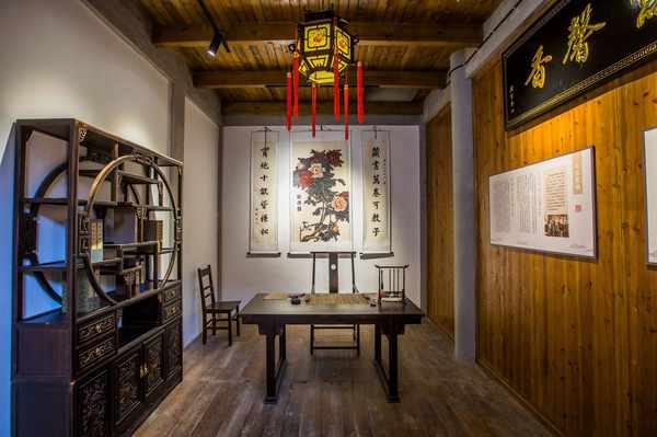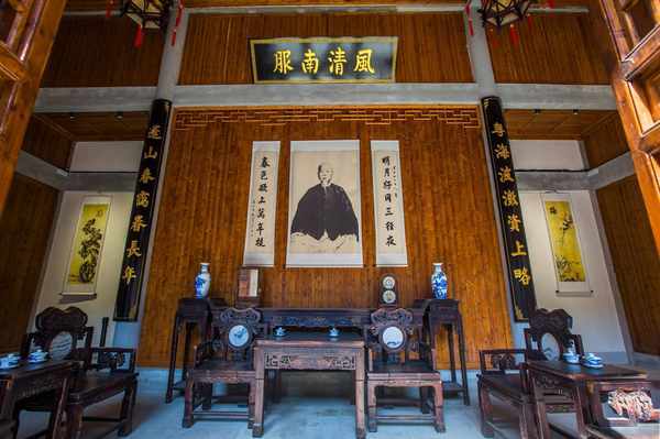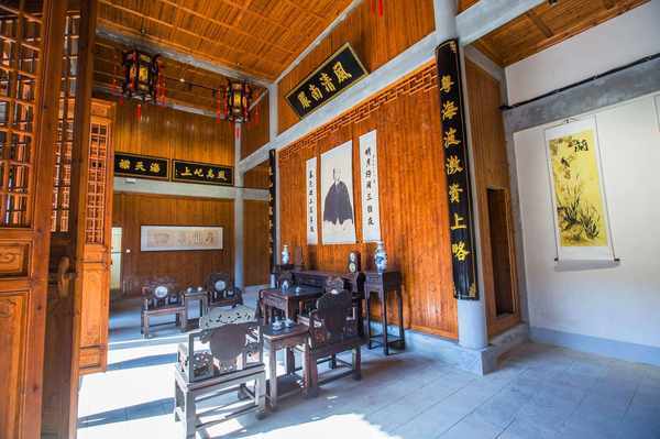 清式家具古朴典雅,整个大厅书香气浓厚。大厅正中的墙上贴着周馥画像,清瘦,长髯,温文敦厚。
