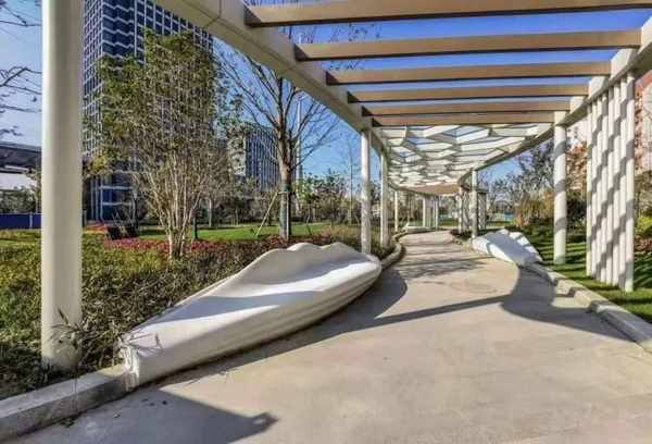 3D打印技术坐凳与镂空的廊架虚实结合,以曲线形态错落穿插在廊架两侧,使空间富有活力和延续性,引导人流前行;座椅曲线根据人体工程学严谨设计,整体造型由4条弧线搭建,简洁流畅,外型张扬,充满个性。