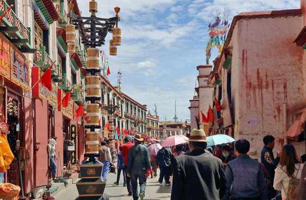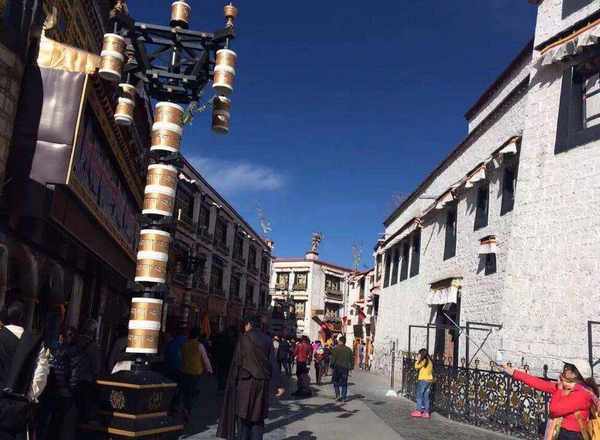 说到八廓街,必要说转经。在拉萨,据说共有三条转经道,分别是三条环形路线。内环就在大昭寺里,称为朗阔,围绕释迦牟尼佛殿转经;中环即是八廓街,围绕整个大昭寺转经;外环的起点和终点都在布达拉宫背后的龙王潭,围绕整个拉萨城诵经。而这三条转经路,八廓街最为繁荣。