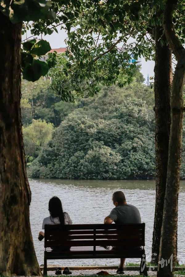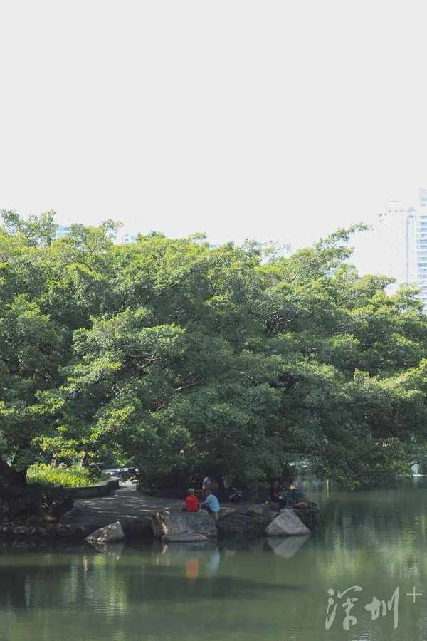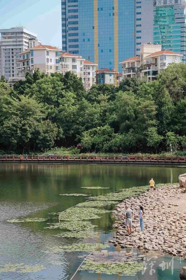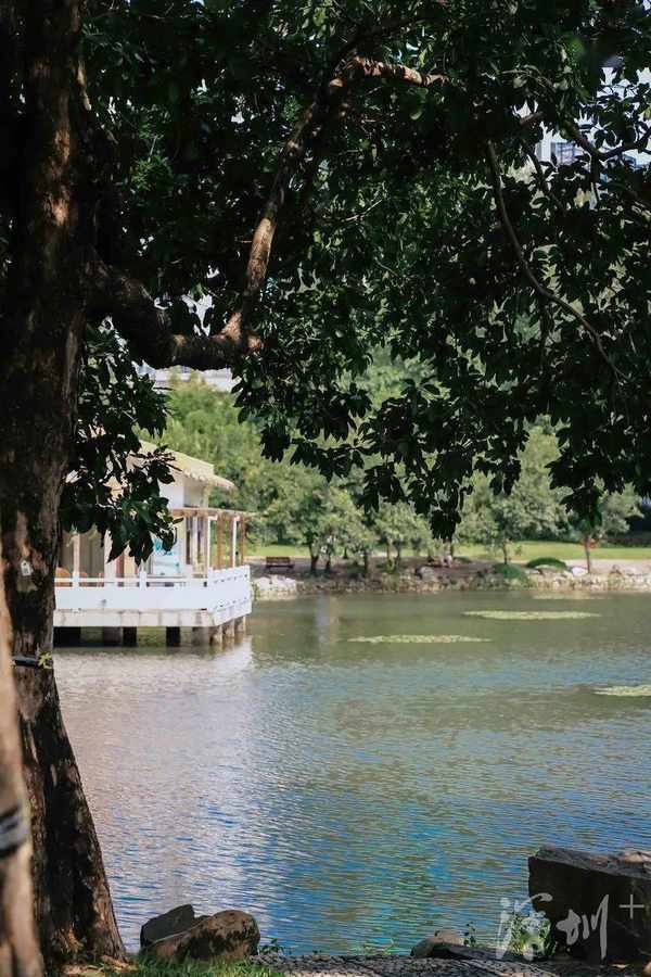 湖边大石滩吸引着不少人戏水玩耍。它设计极富巧思,将荔枝公园的大水系与人连接,因人的参与,让景致变得活泼生动了起来。都市与自然景致的重叠,使荔枝公园像极了藏在都市里的江南水乡。