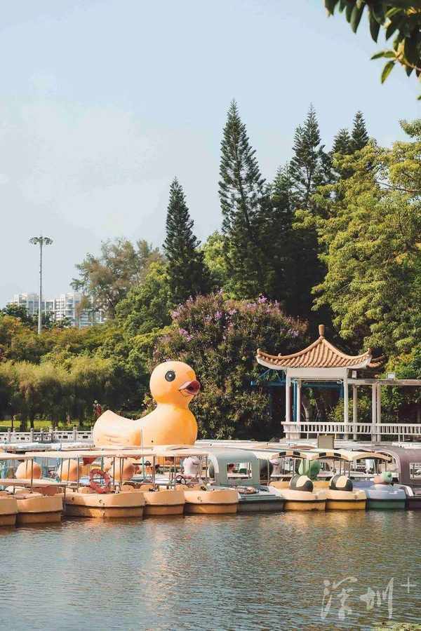 往公园深处走,波光粼粼的巨大湖面出现在眼前,一 只巨大的小黄鸭 静静地陪着一排游艇。