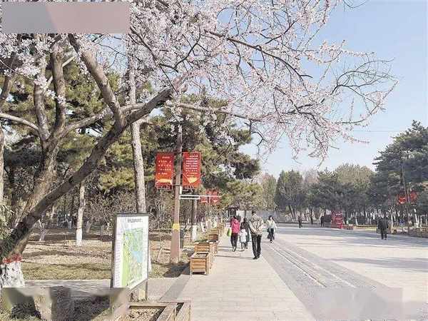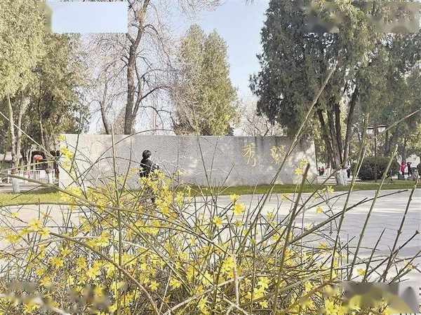 迎春花已经开了。沿着南门往前走100米,一丛丛花儿接力开放,释放出春的信号。一路往北走,迎春花、桃花、玉兰花交相辉映,垂柳、云杉、油松傲然挺立。漫步其中,游客或驻足观赏,或拍照留念。喜爱舞蹈的人们还在桃花树下欢快地跳起舞来,尽情享受着无限美好的盎然春意。