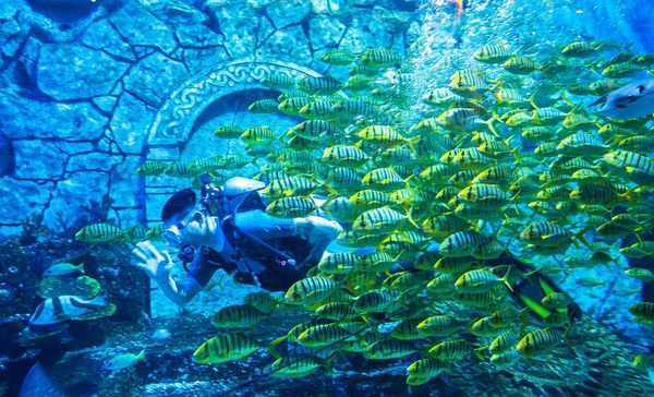 隔着超大的玻璃,近距离观赏海底世界中的水下城堡,成群的鱼儿,海龟,魔鬼鱼等。每天16:00和17:30的《黄金风暴秀》节目,潜水员将与各种海底生物共舞,那场面是既震撼又神奇,非常值得一看。