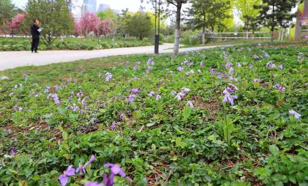 楚楚动人的二月兰也是这处公园里比较普遍的绿地植物,这个季节是二月兰集中绽放的时间,成片成片的蓝紫色,惹人怜爱。
