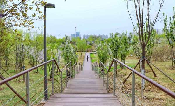 在运动休闲公园靠近西三环路的一侧,有一条模拟“峡谷”的地形,有栏杆木栈道字南而北贯穿。游客市民可以边穿行边赏景,随着地势的上上下下,可以看到公园里不同的风貌。