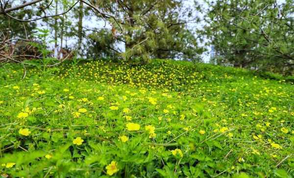 公园树丛里到处都是这种明黄色的小花,密密麻麻遍地都是。很多小孩子喜欢弯着腰低着头认认真真地采摘这种小黄花。