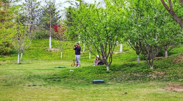 进入滨水文化公园,右手边是牡丹园区,面积不小。适逢假日,大部分牡丹花已经时尚,预计从今年仲春时候陆续都会进入盛花期。旁边是樱花区,不太认得是什么樱花品种,但花开得非常好看,也在盛花期。