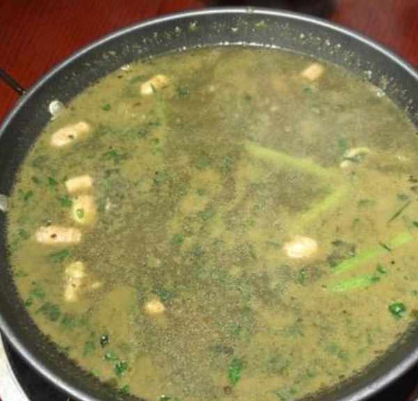 这是把牛肚子里面未消化的青草拿出来熬成汁,颜色看起来绿油油的,然后把这种汁液加到火锅当中,用来烫火锅或者拿来煮汤,吃起来气质微苦,似乎有一股药材的气质。据说牛羊瘪汤营养价值极高,当地人越吃越上头。