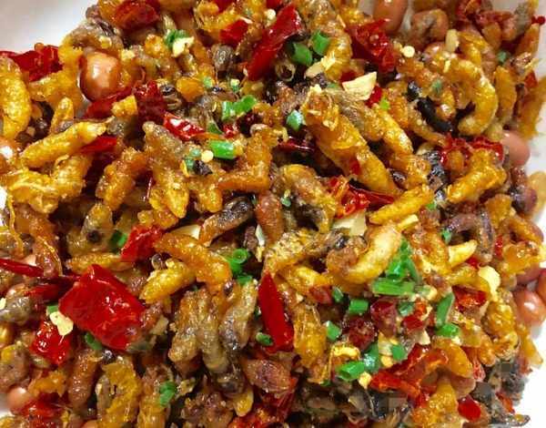 最后一种是油炸蜂蛹。在广西,当地人每年都会去收集许多蜂蛹来作为昆虫佳肴。据说在做这一道菜的时候,要先把蜂蛹蒸熟,先通风晒干,然后再用6成热油,将蜂蛹炸到金黄,放点佐料就可以直接吃,具有很高的营养价值。