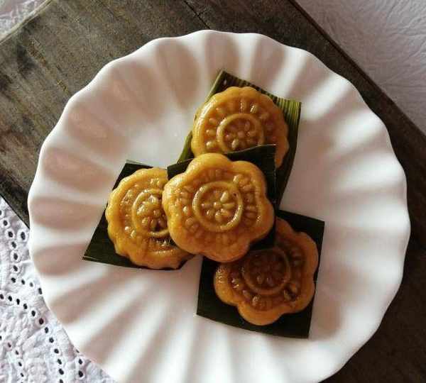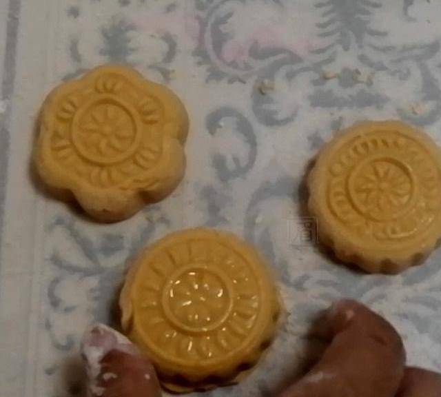 第7步、模具涂油,把做好的南瓜饼胚压入模具,按平后在桌子上磕一下脱模。