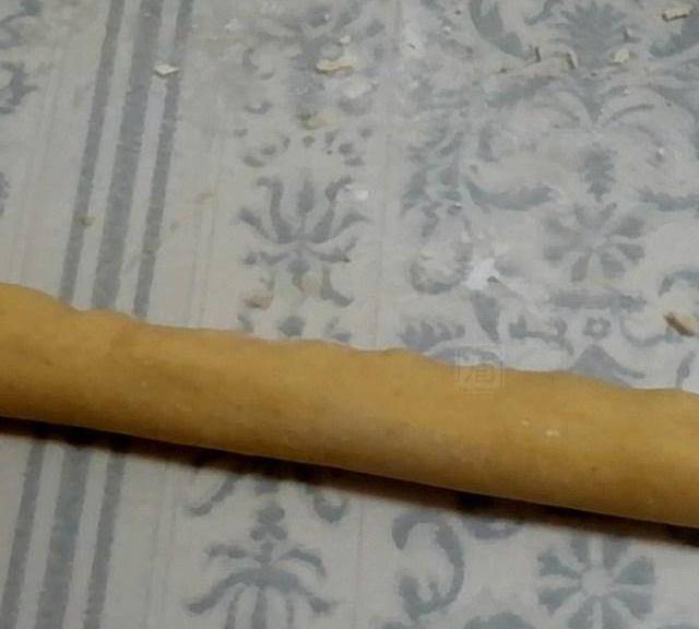 第4步、下手揉面,边揉边看状态,湿了太粘手就加点粉(喜欢糯的就加糯米粉,喜欢硬点儿就加面粉),感觉干了就加南瓜“粥”,没有南瓜“粥”了就加水。揉到略微粘手,面团表面光滑,把面团撒点手粉搓成3~4厘米粗的条状,再摘成3~4厘米长的剂子