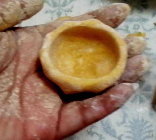 第5步、拿起一个剂子揉捏几下,搓成球,用食指戳一个洞,撒点手粉,大拇指伸进洞中,与食指配合,边转圈边捏成小碗状