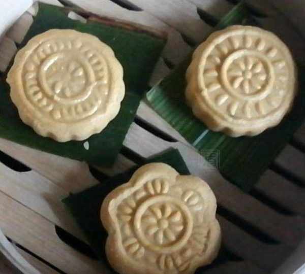 第8步、每个南瓜饼下垫一个剪成方形的粽叶,防粘且有清香。其他有清香的叶子也可以,如桔子叶,实在没有可用硅油纸。装入蒸笼,冷水上锅,大火上气后再蒸8分钟左右。