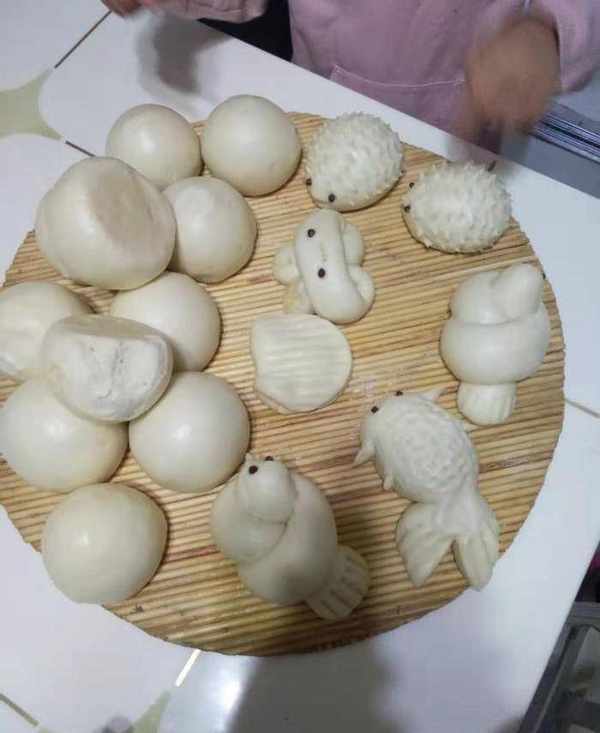 最后就是放入蒸锅里面蒸馒头了。首先把蒸布放入蒸屉上,把揉好的馒头放入,记得每个馒头之间要留有空隙。没有空隙的话蒸熟的馒头会粘连在一起的。放好揉好的馒头后让它在静置十分钟左右,进行第二次发酵。这样蒸出来的馒头又软又有嚼劲。下图是我给孩子蒸的花样馒头