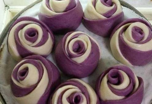 紫薯和面粉和在一起,就变成了紫色面团,发酵以后蒸出来很漂亮。