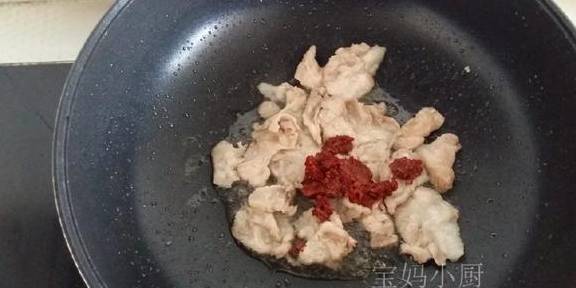 4利用锅内余油,放入五花肉片,煸炒至变色后加郫县豆瓣酱