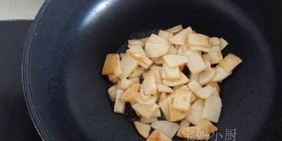 3炒锅加植物油,油温5成热,放入控干水的土豆片,中火煸炒至土豆片表面发黄,铲出备用