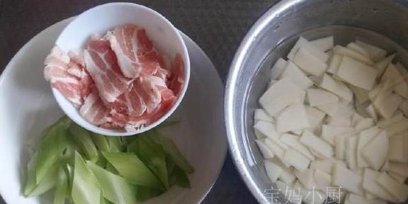 2五花肉切薄片;莴笋切片;土豆切片,泡2遍水;郫县豆瓣酱剁碎