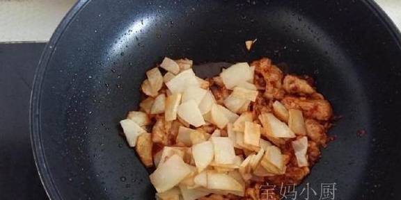 6倒入煸好的土豆片,加3勺清水,翻炒均匀
