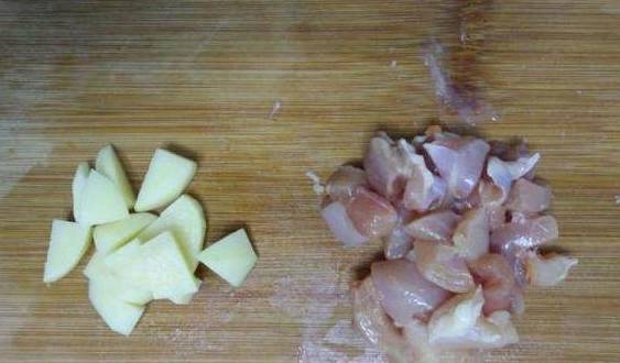 把鸡肉切成小块,去掉鸡腿上的肥油,如果怕宝宝不喜欢肉腥味,可以滴两滴柠檬汁来去腥,土豆去皮切丁备用