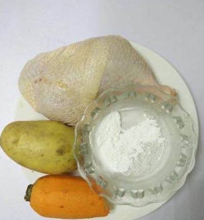 准备食材:鸡肉80g,土豆25g,胡萝卜10g,淀粉5g