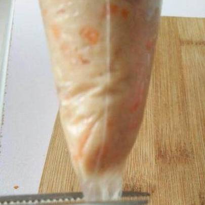 在玻璃碗中放入一个裱花袋,把胡萝卜鸡肉泥放在裱花袋中