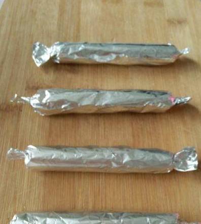 把肉肠挤在锡纸上,把锡纸卷起来