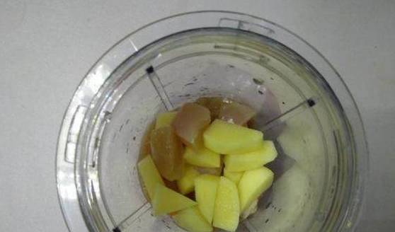 把80g鸡腿和25g的土豆一起放到绞肉机中搅拌