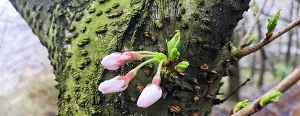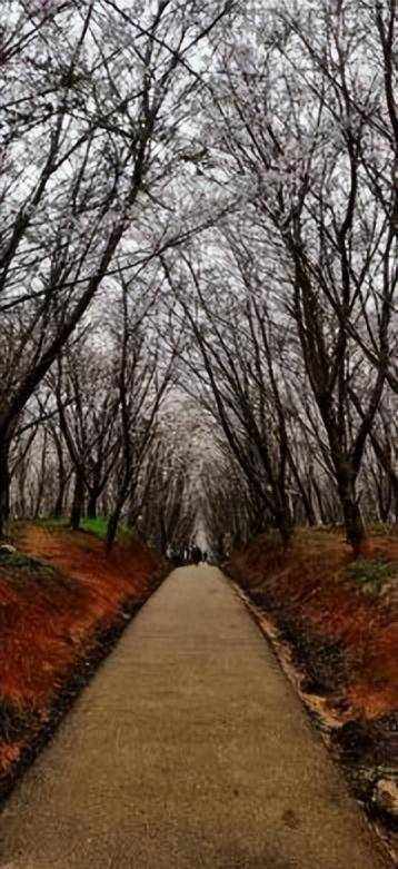 樱花树的树干主要是灰青色的,当它们成排生长起来时,树干部位就看起来比较萧条了,而樱花主要开在上半部分的枝桠,繁花满枝头形容的就是此刻我眼前的景象吧!