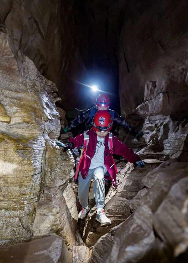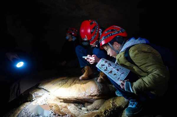组成科考队,进入原始洞穴考察与探索; 教练指导下,运用绳降、攀岩技术穿越高低层叠的洞道;教练科普洞穴生物、洞穴沉积物; 对照《洞穴自然营观察手册》发 现洞穴生物、沉积物、洞穴岩溶现象;感受洞穴生物黑暗的生活环境;在实景游历中收获知识,提升勇气